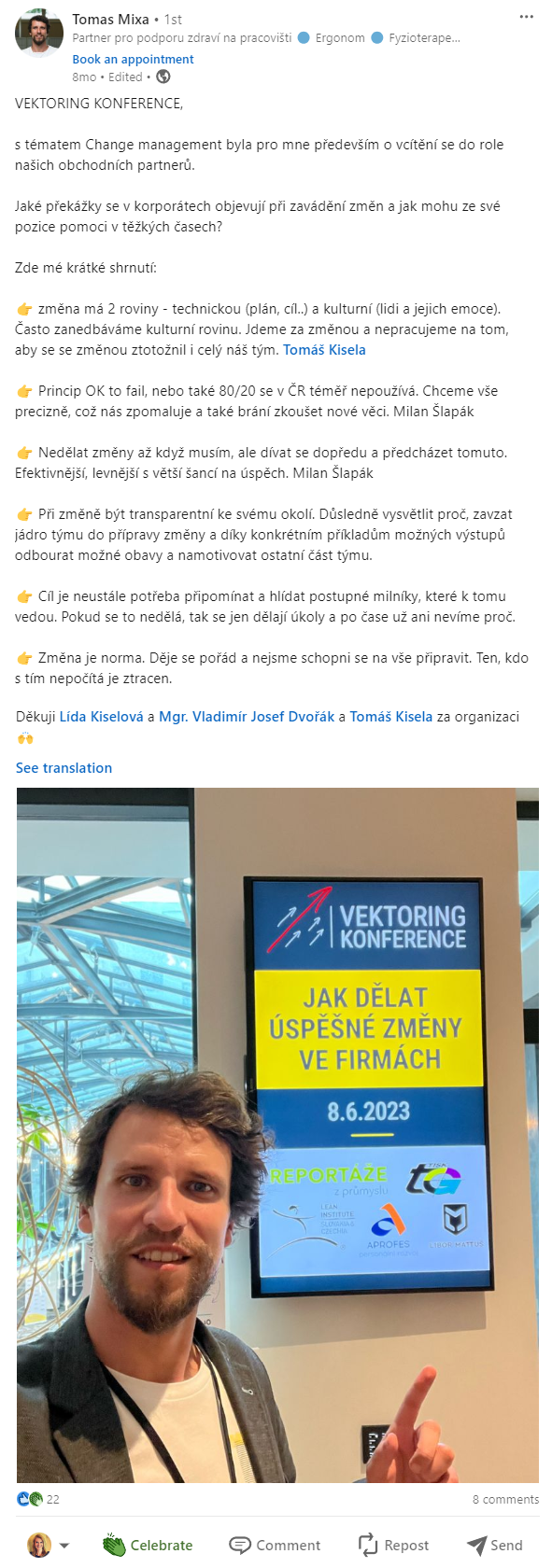 Angažuje se také v mnoha networkingových akcích a je součástí hlavních organizačních týmů konferencí Lean Summit CzechoSlovakia, BeExcellent, Vektoring konference a Řízená Evoluce.